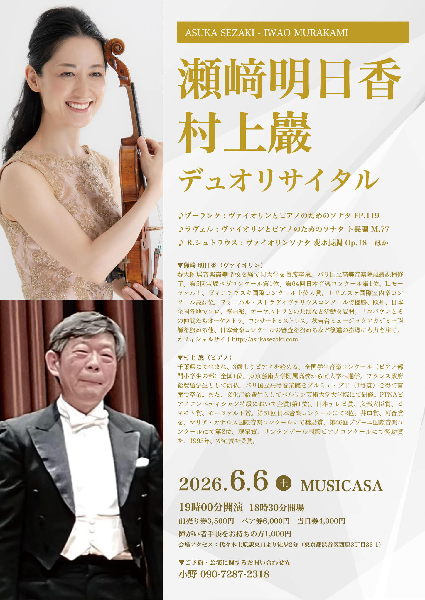 村上巖&瀬﨑明日香デュオリサイタル 投稿日: 2026年2月28日2026年4月1日 投稿者: asukasezaki Calendar カレンダーに追加 Timelyカレンダーに追加 Googleに追加 Outlookに追加 Appleカレンダーに追加 その他のカレンダーに追加 Export to XML いつ: 2026年6月6日 @ 7:00 PM – 9:00 PM 2026-06-06T19:00:00+09:00 2026-06-06T21:00:00+09:00 どこで: 代々木上原ムジカーザ