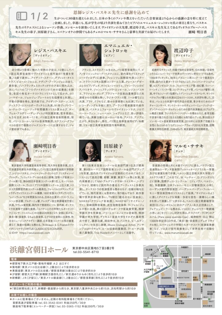 レジス・パスキエ&瀬﨑明日香vol.3~デュオと室内楽 投稿日: 2026年1月3日 投稿者: asukasezaki Calendar カレンダーに追加 Timelyカレンダーに追加 Googleに追加 Outlookに追加 Appleカレンダーに追加 その他のカレンダーに追加 Export to XML いつ: 2026年3月23日 @ 2:00 PM – 4:00 PM 2026-03-23T14:00:00+09:00 2026-03-23T16:00:00+09:00 どこで: 浜離宮朝日ホール