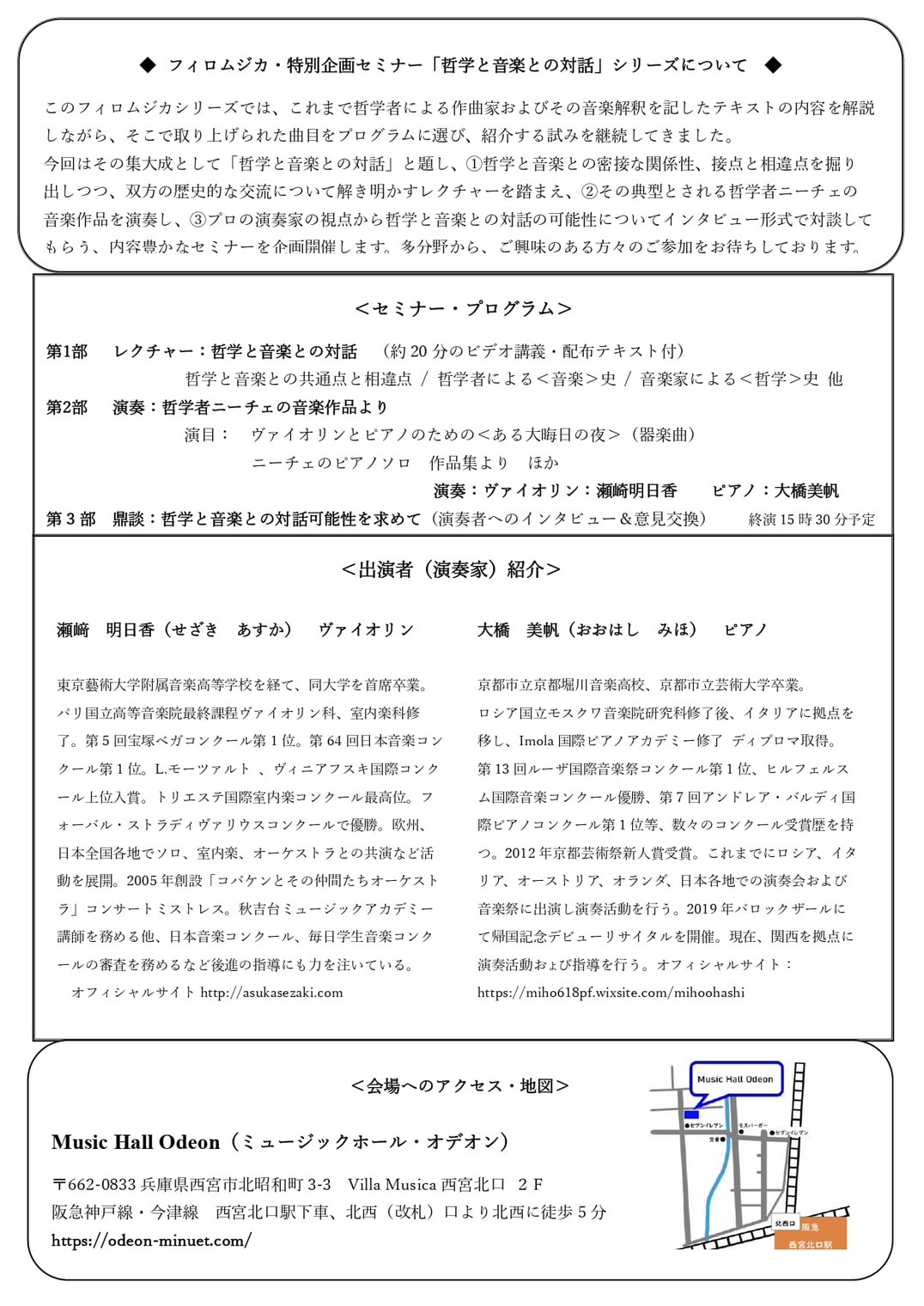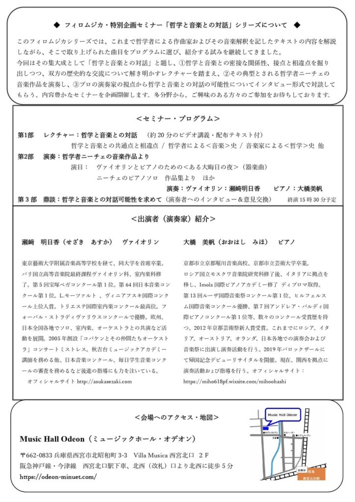 哲学と音楽との対話~ ニーチェの音楽作品を手掛かりに 投稿日: 2026年1月4日2026年4月1日 投稿者: asukasezaki Calendar カレンダーに追加 Timelyカレンダーに追加 Googleに追加 Outlookに追加 Appleカレンダーに追加 その他のカレンダーに追加 Export to XML いつ: 2026年5月4日 @ 2:00 PM – 4:00 PM 2026-05-04T14:00:00+09:00 2026-05-04T16:00:00+09:00 どこで: 西宮Music Hall Odeon 料金: 一般3500円、会員3000円、学生2000円