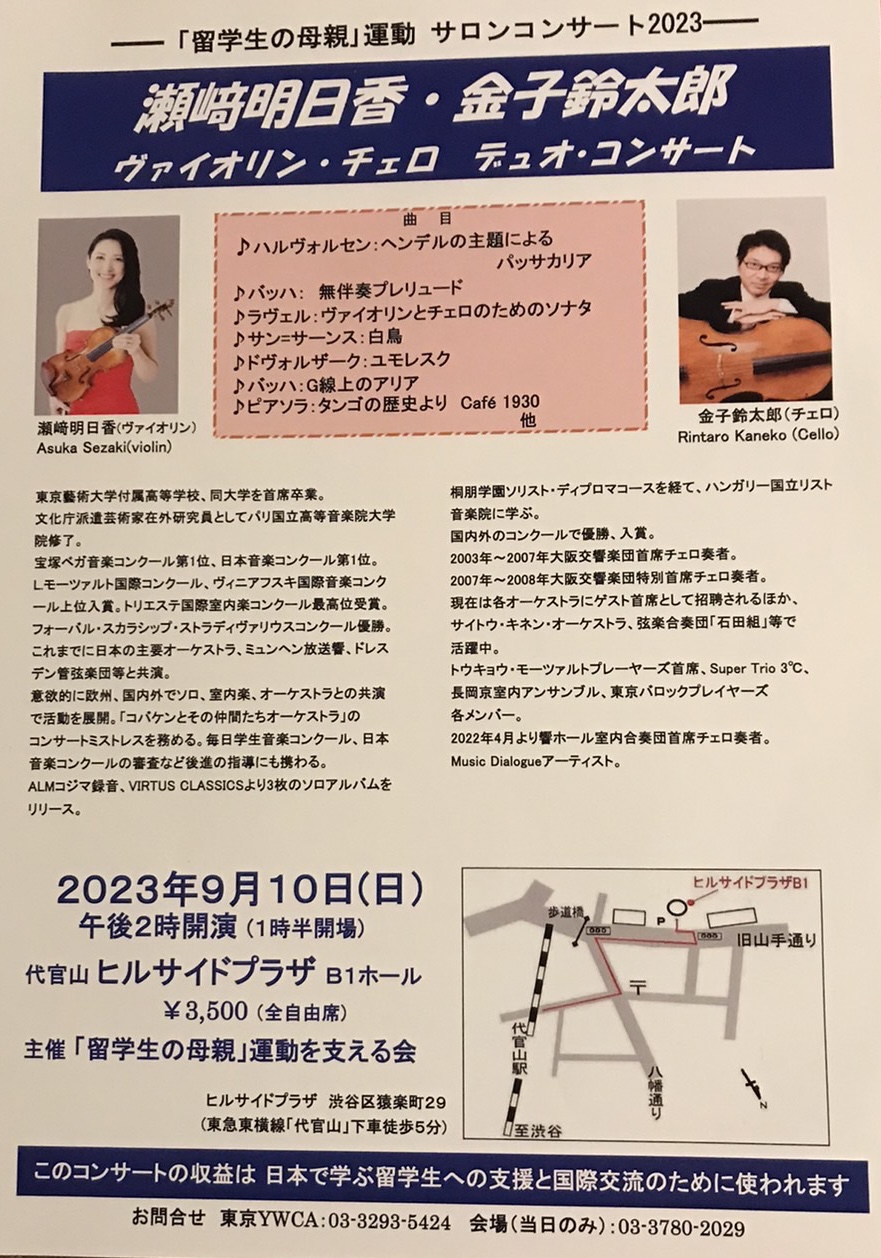 留学生の母親運動サロンコンサート2023 投稿日: 2023年6月13日2023年6月22日 投稿者: asukasezaki Calendar カレンダーに追加 Timelyカレンダーに追加 Googleに追加 Outlookに追加 Appleカレンダーに追加 その他のカレンダーに追加 Export to XML いつ: 2023年9月10日 @ 2:00 PM – 4:00 PM 2023-09-10T14:00:00+09:00 2023-09-10T16:00:00+09:00 どこで: 代官山ヒルサイドプラザ 料金: 3500円 連絡先: 東京YWCA 03−3293-5424